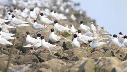 Enorme kolonie Zwartkopmeeuwen op broedeilanden in het Haringvliet. De populatie op de Ventjagersplaten groeit uit tot de grootste kolonie in de Delta.