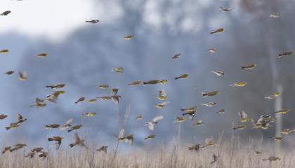 Zeldzaam tafereeltje: groepen Geelgorzen (en meer) boven een akker.